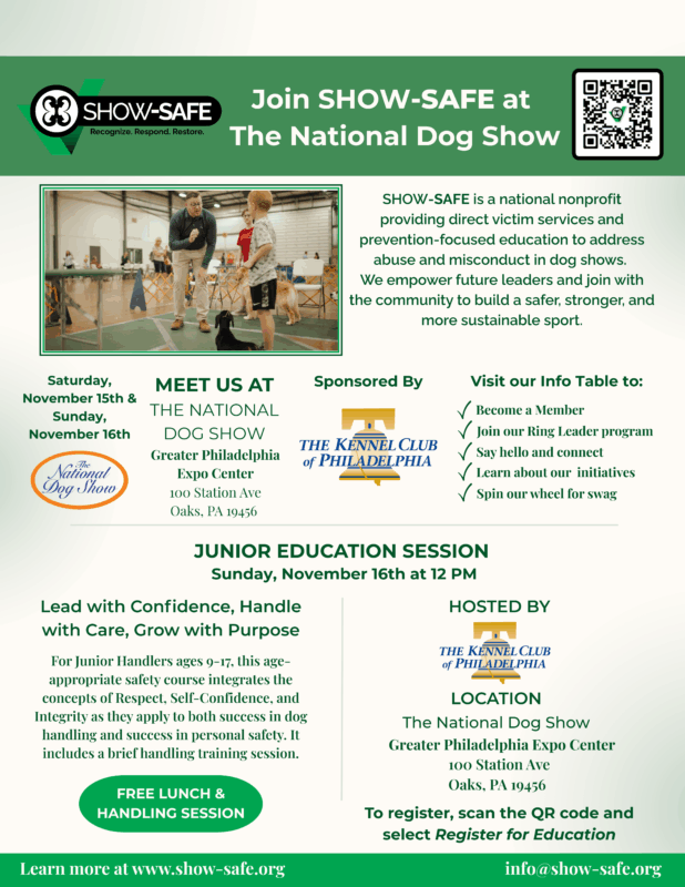 This interactive session empowers youth by integrating the concepts of Respect, Self-Confidence, and Integrity as they apply to both success in dog handling and personal safety.