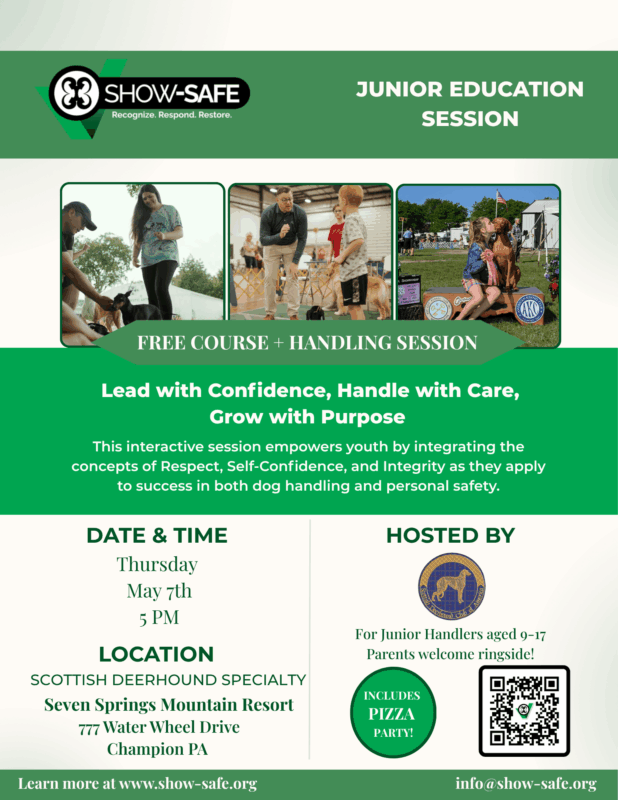 This interactive session empowers youth by integrating the concepts of Respect, Self-Confidence, and Integrity as they apply to both success in dog handling and personal safety.