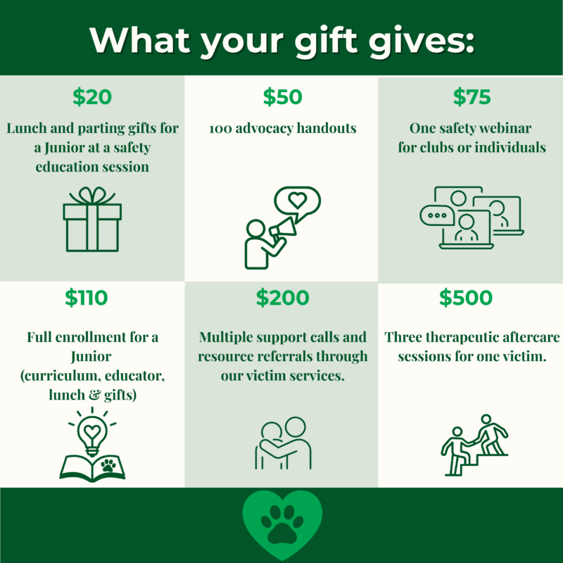 Think of your gift as more than an entry—it’s a lifeline. With just $5, you’re helping juniors learn how to stay safe while securing your spot in the Season of Safety Sweepstakes. Now through November 12th every $20 is doubled to 16 entries, plus every gift provides critical support for survivors. When you give, you’re standing shoulder-to-shoulder with those who deserve safer spaces. This is about change, not charity—and it starts with you.